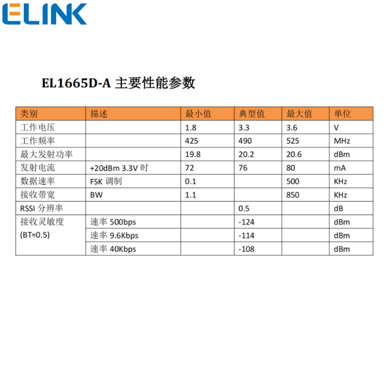 EL1665D-A 是一款采用 SI4438 內(nèi)核設(shè)計(jì)的輸出功率為 100mW 的高性能 無(wú)線(xiàn)收發(fā)通訊模組。工作頻段為 425MHz~525MHz,默認(rèn)頻段為 490MHz。 EL1665D-A 是高性能低電流的 425MHz~525MHz 收發(fā)模組,采用 SI4438 內(nèi)核設(shè)計(jì),包括完整的發(fā)送器和接收器。接收靈敏度為-124dBm,最大輸出 功率+20dBm,支持(G)FSK,OOK 調(diào)制方式,數(shù)據(jù)速率從 100bps~500Kbps,工作 電壓 1.8V~3.6V,關(guān)斷電流 30nA,待機(jī)電流 50nA。主要應(yīng)用在遠(yuǎn)傳抄表 (802.15.4g & MBus)、遙控、家庭安全和告警、車(chē)庫(kù)和大門(mén)開(kāi)啟、遙測(cè)、家 庭自動(dòng)化、傳感器網(wǎng)絡(luò)、健康監(jiān)視等。