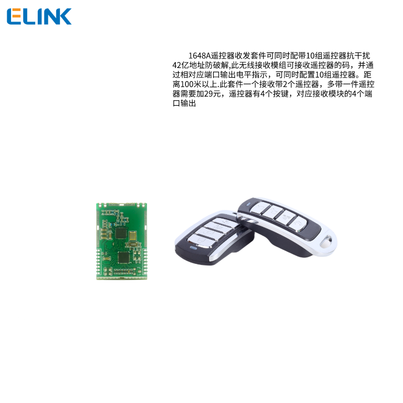 EL_1648A 系列是一款低成本,高性能的 FSK 無線透明數(shù)據(jù)收發(fā)模塊。此無線接收模組可接收遙控器的碼,并通過相對應(yīng)端口輸出電平指示,可同時配置10組遙控器。